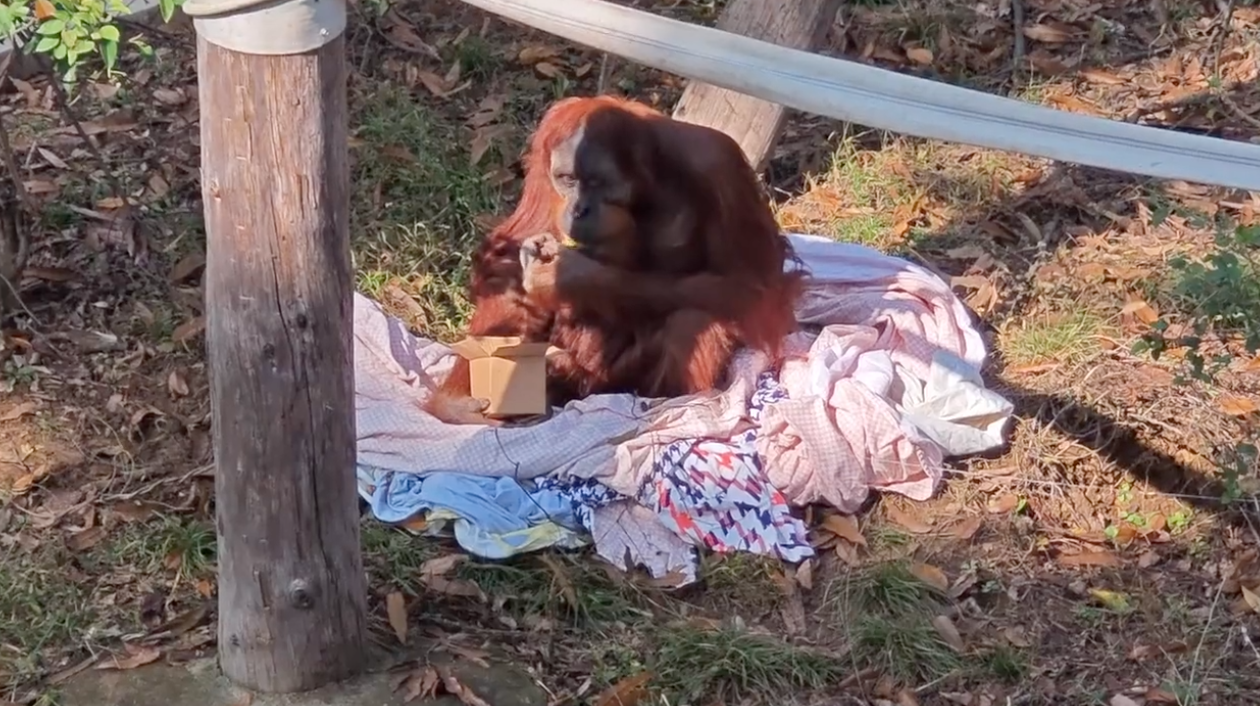 红毛猩猩的“生活智慧”简直藏不住!他们超会利用饲养员提供的床单、毯子,把日子过得舒舒服服。大太阳晒?没关系!他们会把毯子往身上一披,瞬间挡住刺眼阳光,妥妥的“天然遮阳神器”;又或是拿床单当“玩具”;
