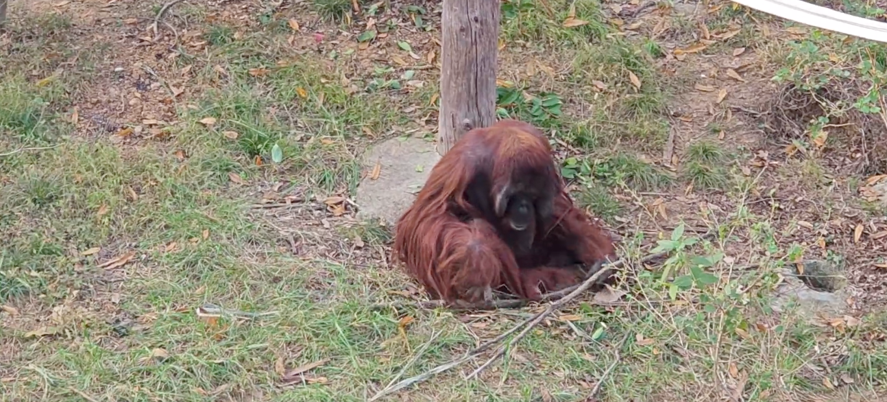 这些掉落的银杏果,最先还是红毛猩猩小律发现的。每当路过时,她会蹲坐下来捡拾银杏果,但吃法可有些不同:吃皮,不吃“果肉”,会用嘴把果肉吐出。