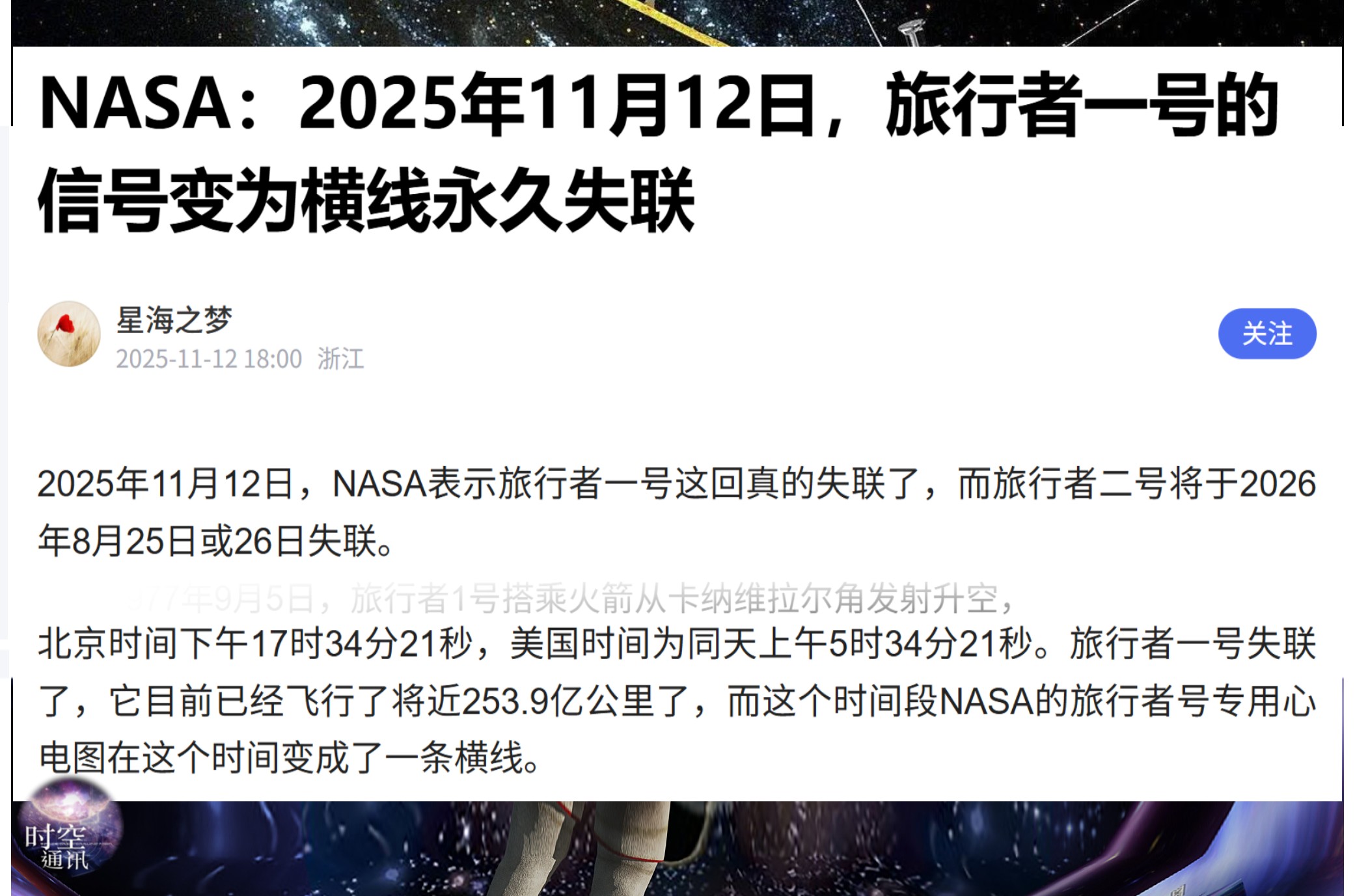 看到几篇发布这个消息的文章,称2025年11月12日,旅行者1号传回的信号变成一条直线,就像人类的心脏停止了跳动,这一刻停留在北京时间17时34分21秒(美国时间5时34分21秒),此时旅行者1号距离地球253.9亿公里。又说NASA(美国航空航天局)表示,旅行者1号不是像从前只是由于故障短暂失去联系,此次为永久失联。