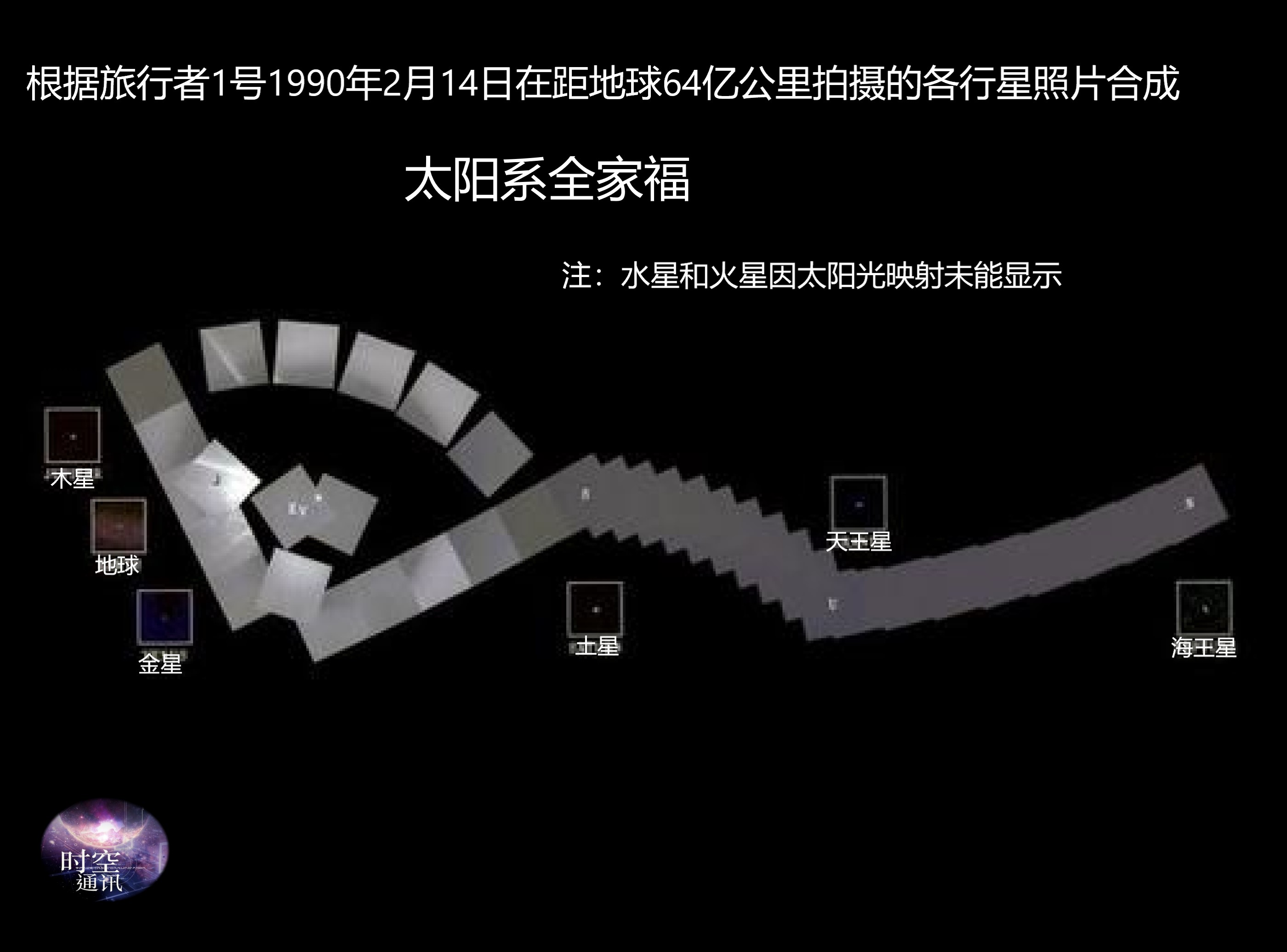 基于旅行者1号拍摄的照片,科学家们拼接出了一张太阳系全家福,是人类首次从太阳系外部视角,完整记录所有行星的分布状态,直观呈现了太阳系的整体结构。由于水星、火星太小,难以在照片中呈现,其余6颗行星放大后才得以呈现。