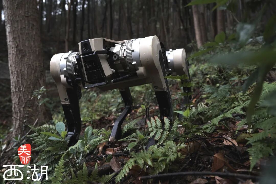 在位于双浦镇石山下矿坑艺术公园的机器人中试基地的测试场上,一道棕黑色身影正敏捷地穿梭在各种复杂地形间。它踏过松软的沙地,纵身跃过积水坑洼,又在崎岖草坡上连续翻滚。