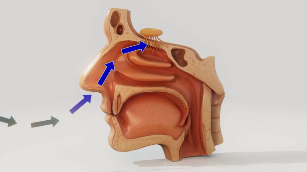 当你把食物放入口中,咀嚼和吞咽的动作会将其中的风味物质(挥发性分子)释放出来。这些分子从口腔后部向上窜,通过一个叫做“鼻后孔”的通道,进入鼻腔,被嗅觉受体捕获。