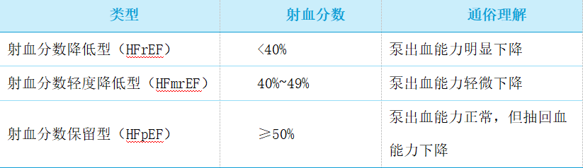 临床上最常见的是左心衰竭,医师根据超声心动图报告上提供的左心室射血分数(LVEF)(即心脏收缩期与舒张期的射血量比值)将左心衰竭分成3种类型:射血分数降低型(HFrEF)、射血分数轻度降低型(HFmrEF)、射血分数保留型(HFpEF)。