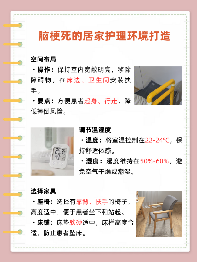 地面要保持干净干燥,有地毯的可以暂时收起,防止绊倒;卫生间的马桶旁和淋浴区安装扶手,床边安装护栏,椅子选择高度合适的,降低患者跌倒风险,对于平衡能力还在恢复的患者来说,一次跌倒可能让之前的努力前功尽弃。同时,简化室内空间,清理多余的杂物,保证轮椅和助行器能顺畅通行,让患者活动起来更方便。