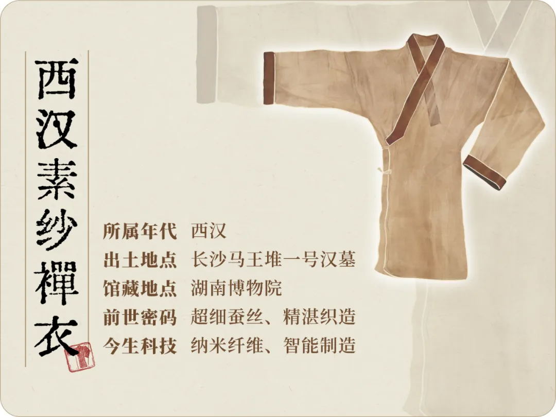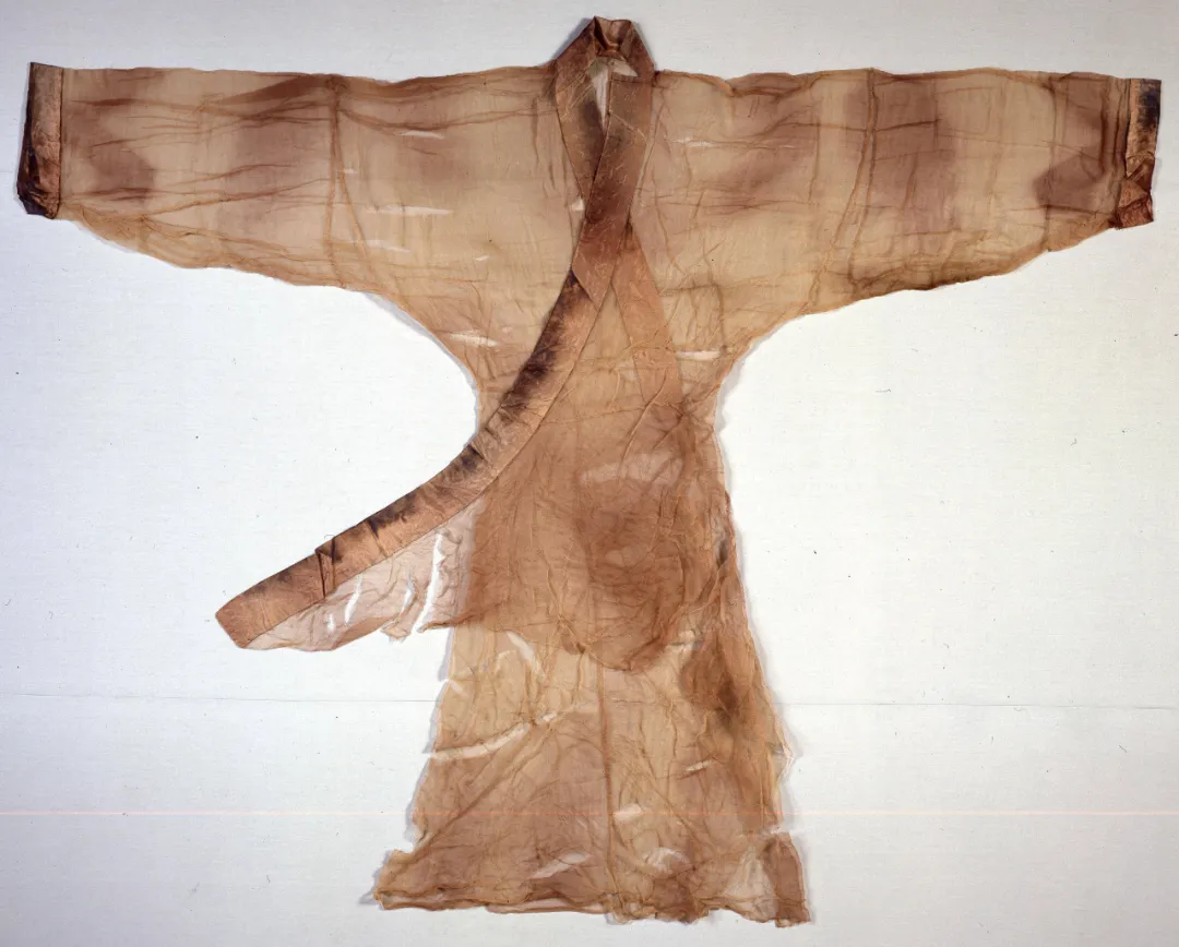 1972年,湖南长沙马王堆一号汉墓出土了两件素纱襌衣,展开时薄如蝉翼,轻若晨雾,被誉为迄今世界上最轻薄的古代丝织衣物。