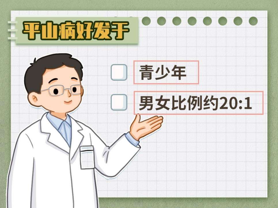 平山病好发于11-12岁至17-18岁的青少年阶段,可能与青春期的快速生长发育密切相关。男性患者占绝大多数,男女比例接近20:1,可能与男孩在青春期的“蹿个”现象(身高在短期内迅速增长)更为明显有关。