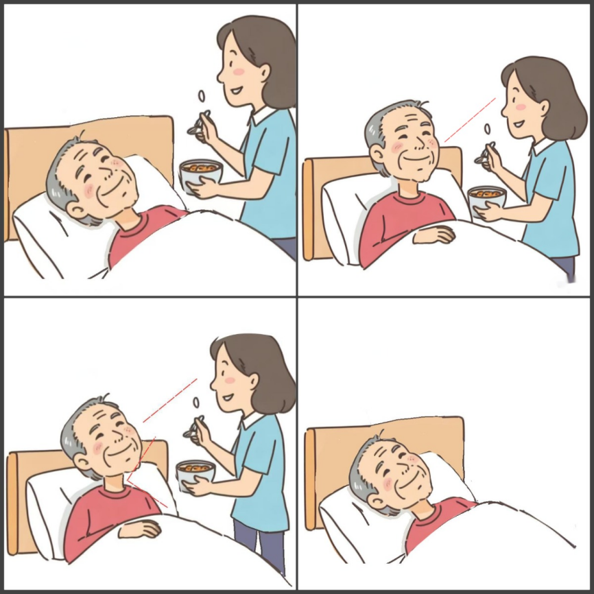 1.仰头喂饭:让老人平躺喂饭,或喂饭的人站得太高、勺子抬得过高,导致老人必须仰头吞咽。这个姿势会让气道处于开放状态,食物容易滑进气道。