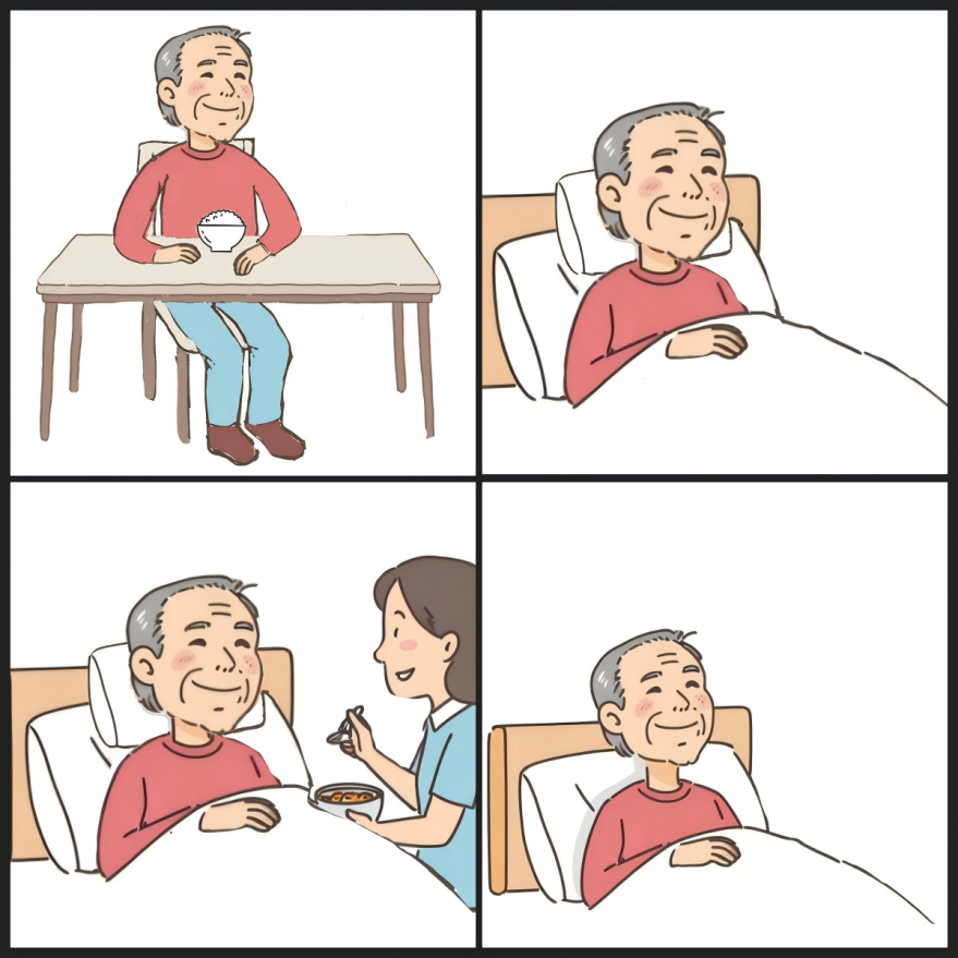 老王脑梗后成了失能老人,日常起居全靠家人和保姆照顾。他反复肺炎住院,正是因为吞咽功能障碍+喂饭方式错误双重影响。