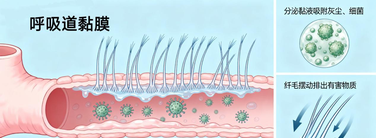 然而,一部分患者由于感染比较重,形成的痰液过多,无法有效依靠纤毛排出;纤毛需要一定的湿润度才能正常工作,有些患者由于气道干燥,湿化不足,导致纤毛无法有效工作,致使痰液堆积在肺、毛细支气管深部,痰液的粘性使其牢牢吸附在肺、毛细支气管,无法排出。