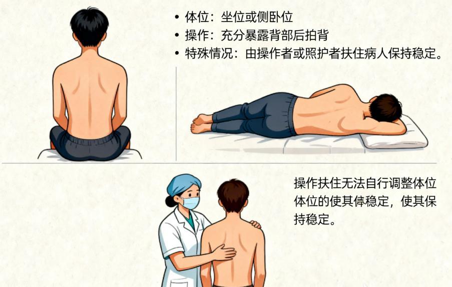 体位:取坐位或侧卧位,使背部充分暴露。对于无法自行调整体位的病人,可由操作者或照护者轻轻扶住病人,使其保持稳定,充分暴露背部后进行拍背。
