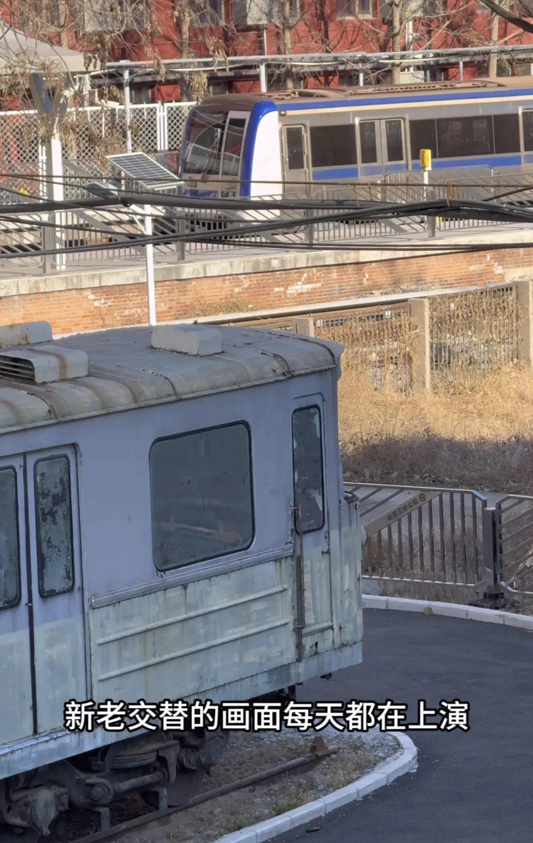 小区里有一座跨越车辆段的天桥,每天早晚高峰前后,桥下都会有进出段的地铁列车经过。车辆段里还停着退役的地铁老车,新老交替的画面每天都在上演。
