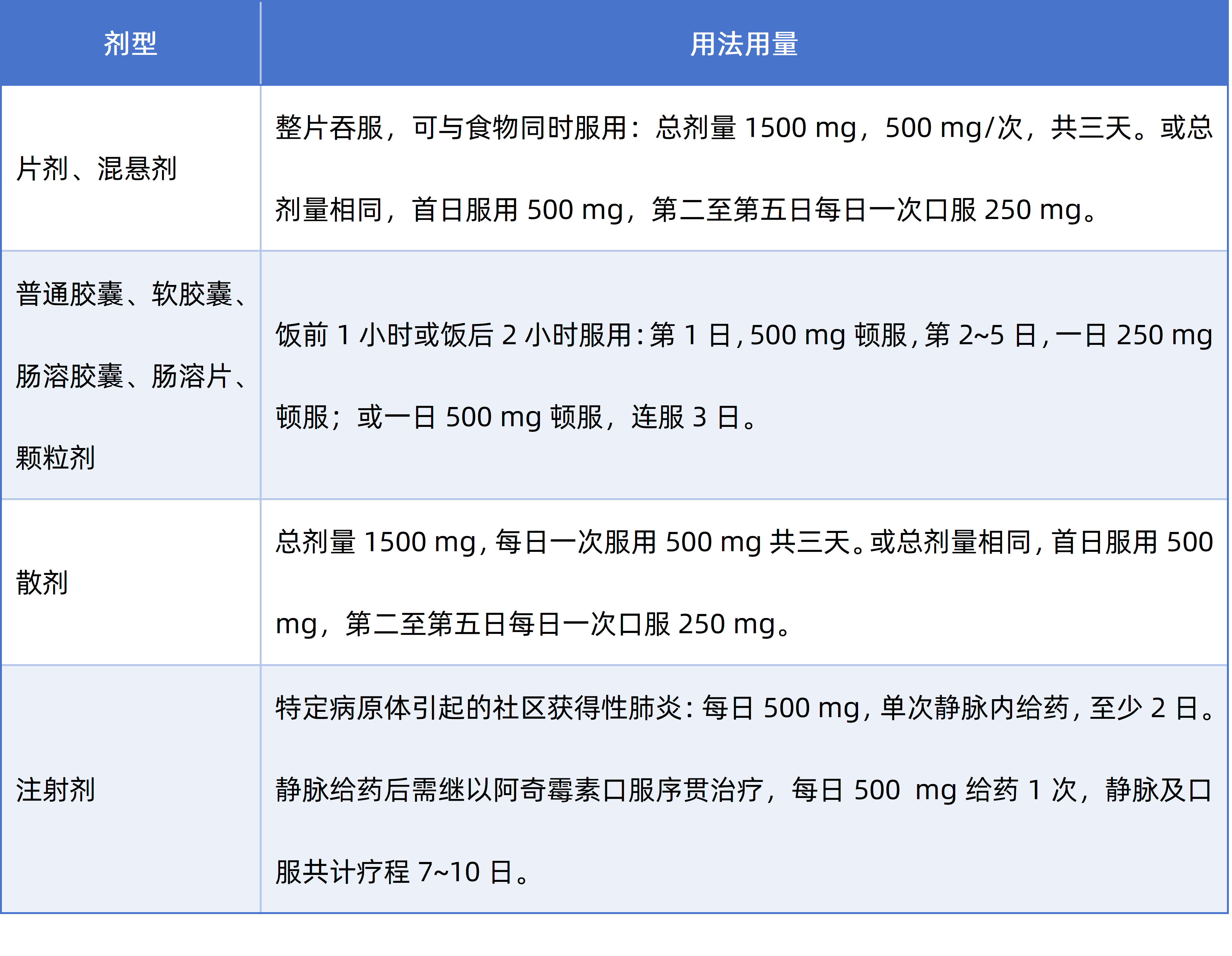 阿奇霉素的剂型多样,包括片剂、分散片、颗粒、胶囊、软胶囊、注射剂等,不同剂型的吸收特点、服用时间及剂量存在差异,且儿童与成人用量需严格区分,具体用法用量需遵医嘱执行,以下为临床常用规范: