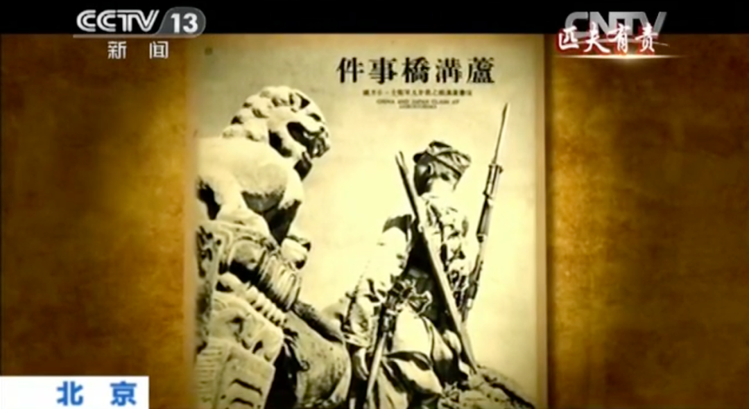 △方大曾拍摄的组图之一。一名士兵站在卢沟桥上,脚下是卢沟桥,背后是钢枪。