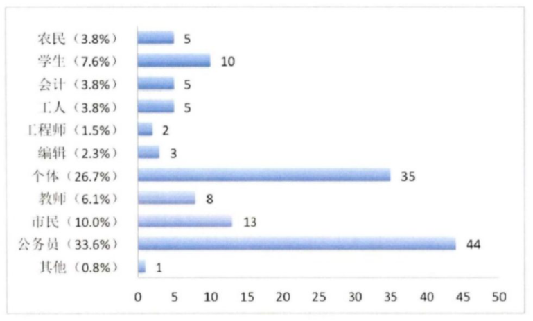 或许正是因为医院的特殊性,来八大处整形外科医院做处女膜修复手术的患者统计信息有些出人意料。一篇北京协和医学院博士生学位论文统计调查了在这家医院接受处女膜修复手术患者的职业(见下图)。