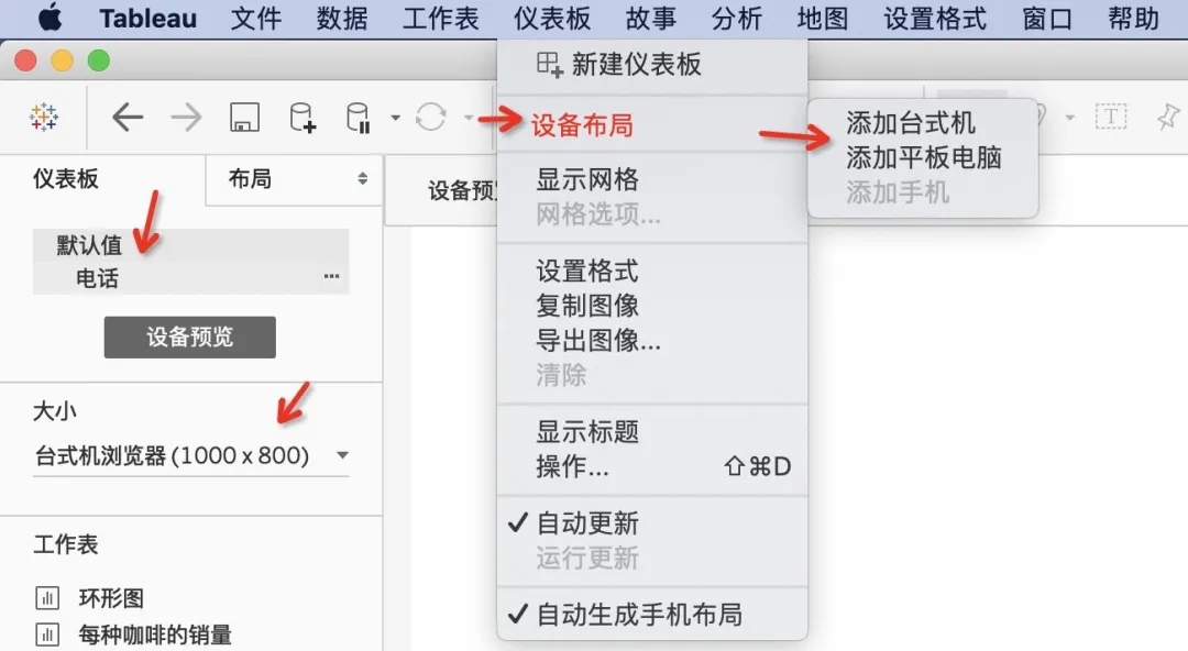 在Tableau中,你可以控制报表页的布局和格式设置,如大小和方向。