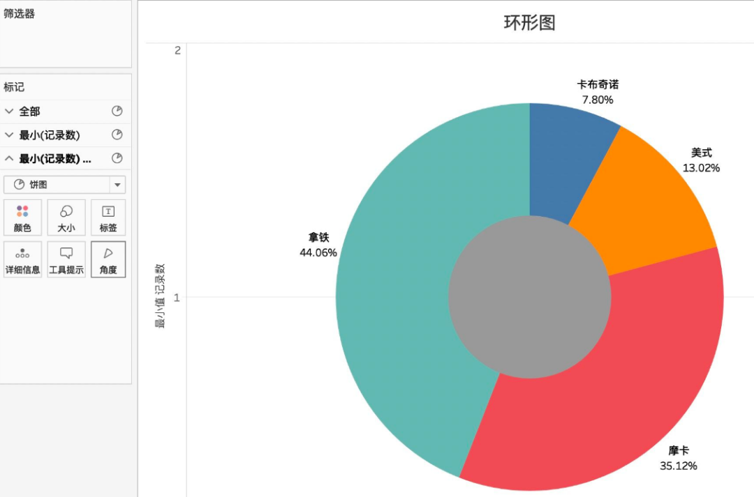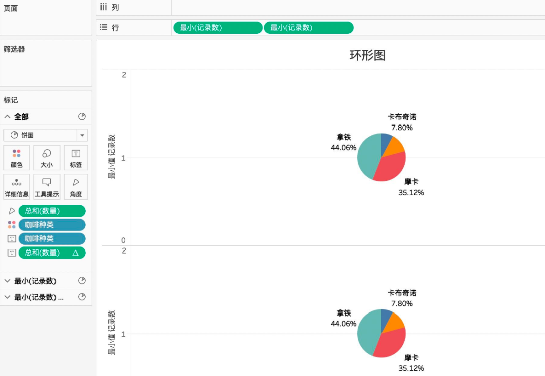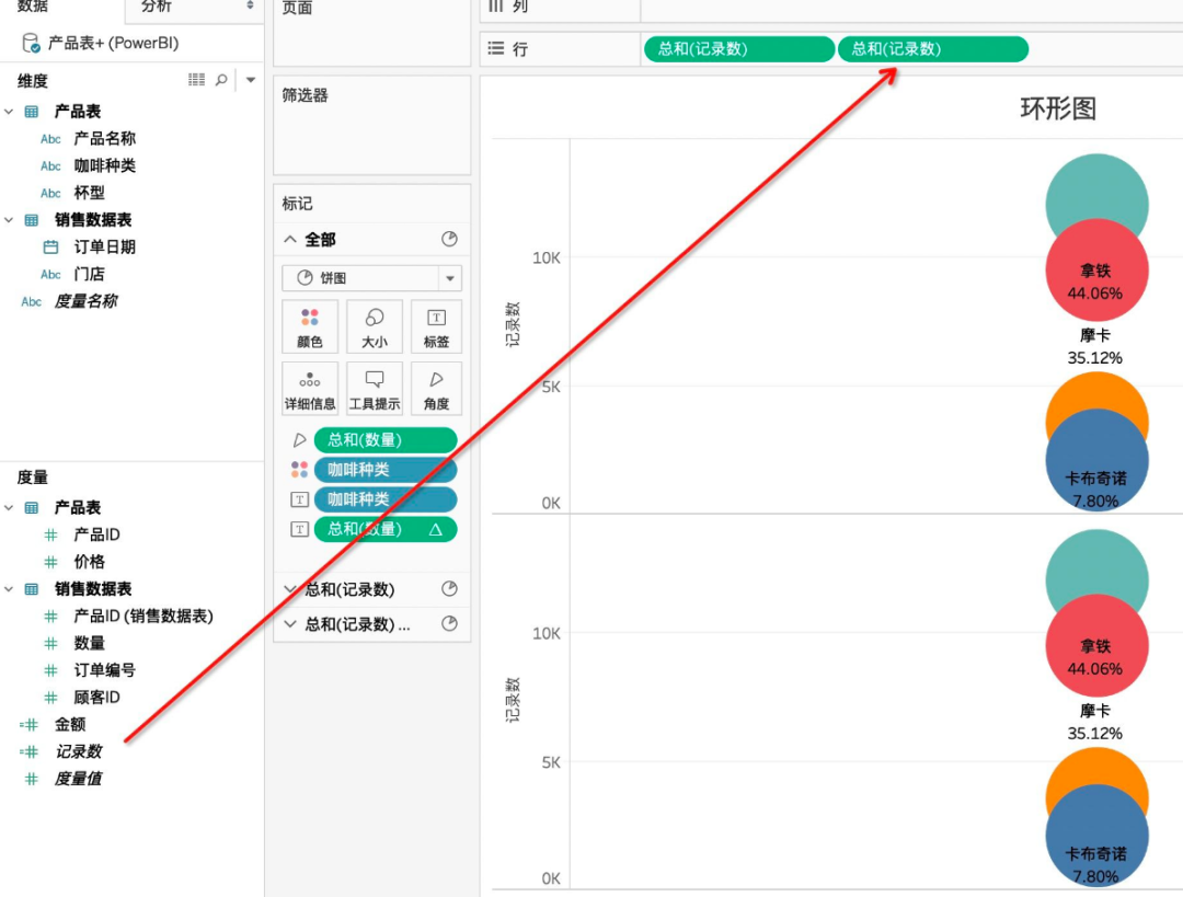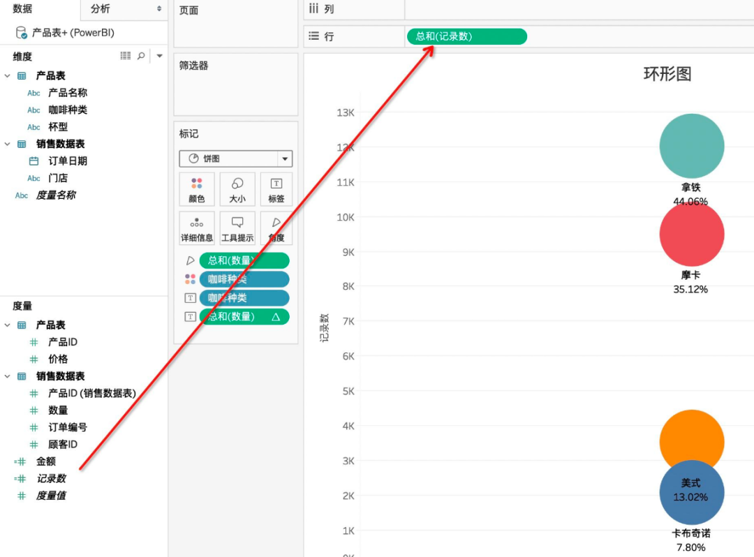 饼图制作完成,接着我们开始制作环形图,需要将【度量】中的【记录数】拖入【行】中