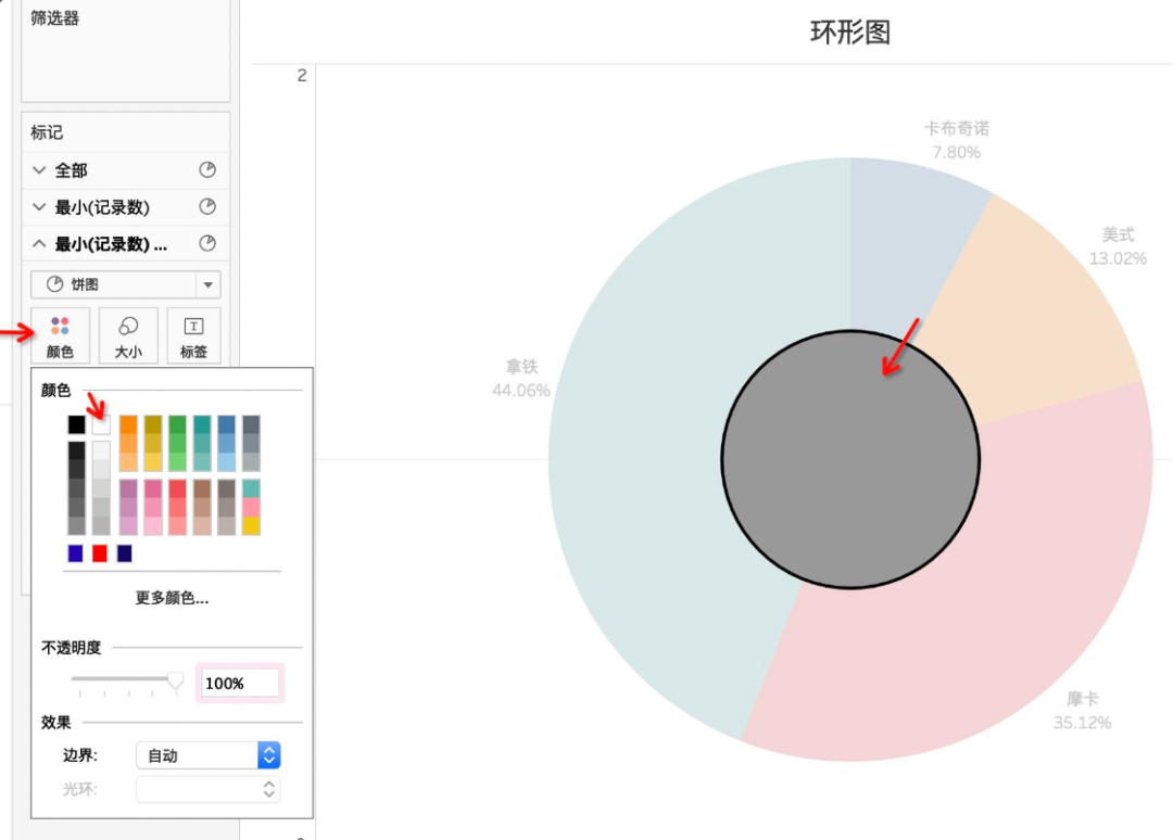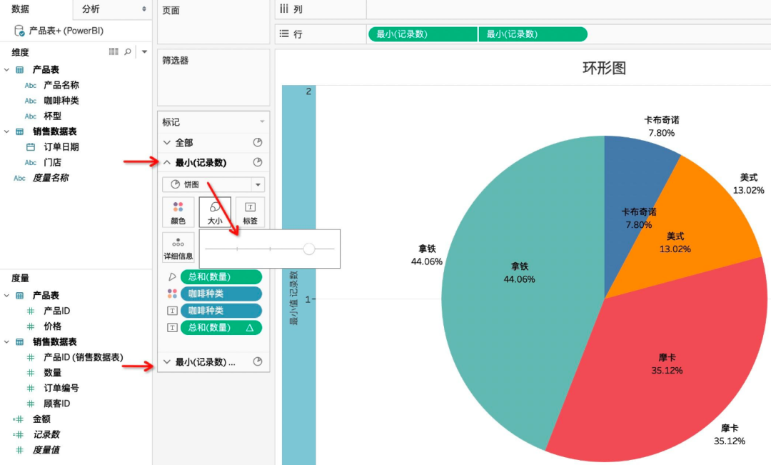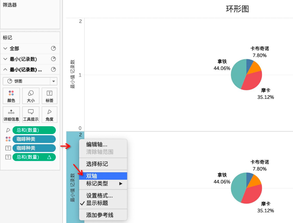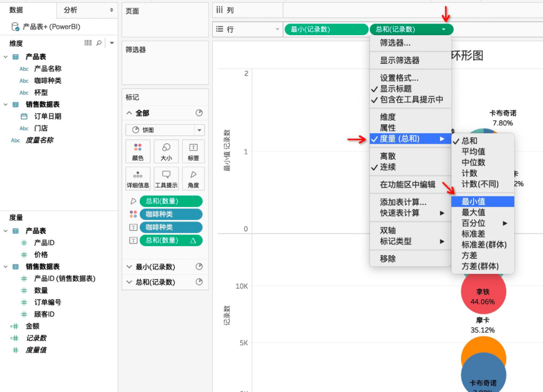 饼图制作完成,接着我们开始制作环形图,需要将【度量】中的【记录数】拖入【行】中
