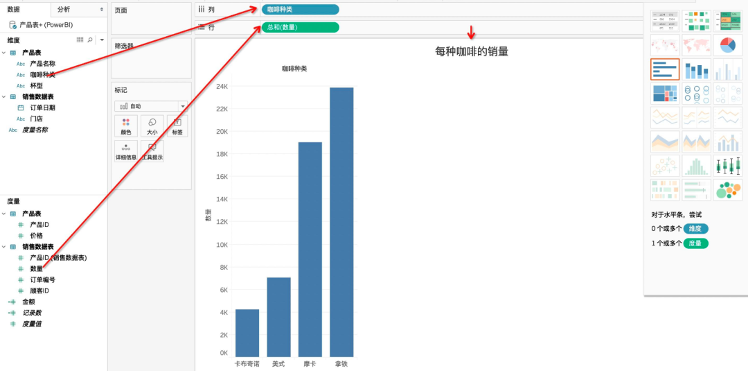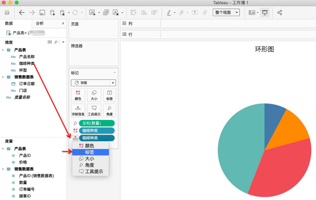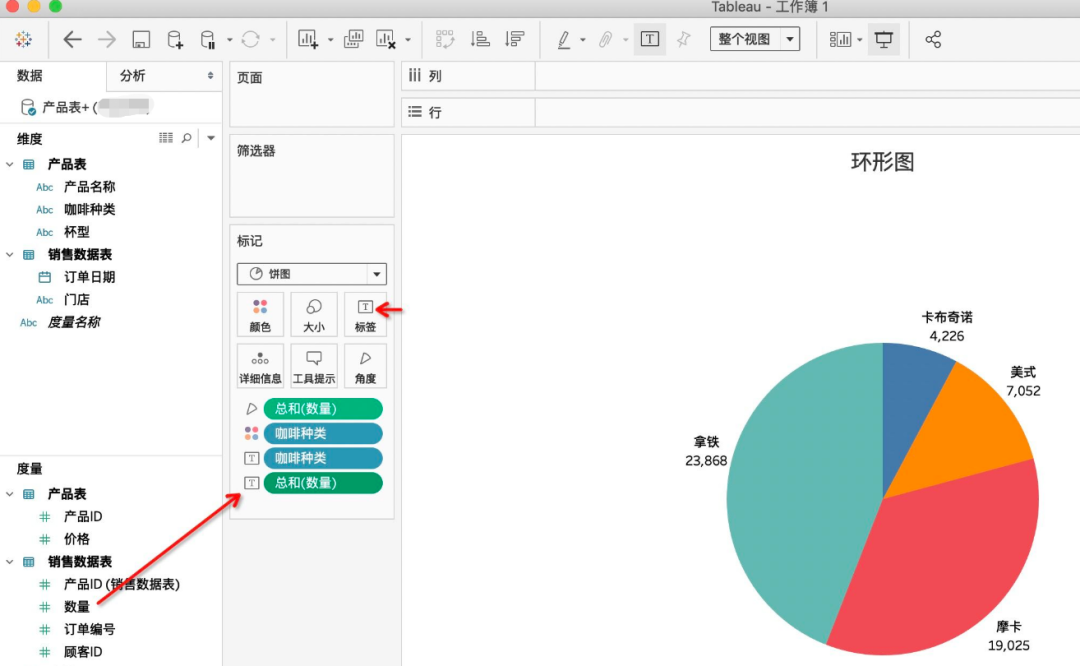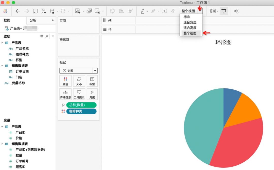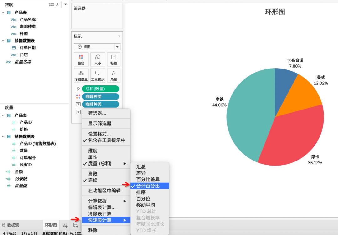 现在假如领导想要知道每种咖啡的下单数量占总数量是多少,如何用Tableau来实现呢?