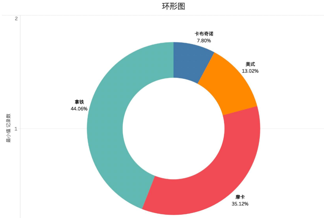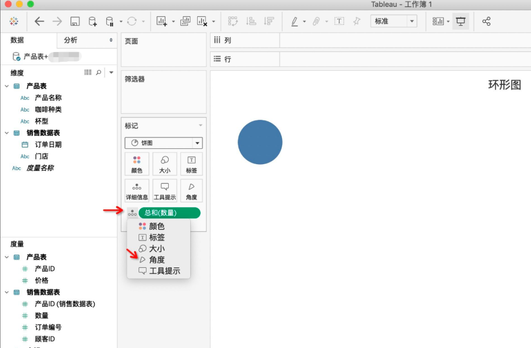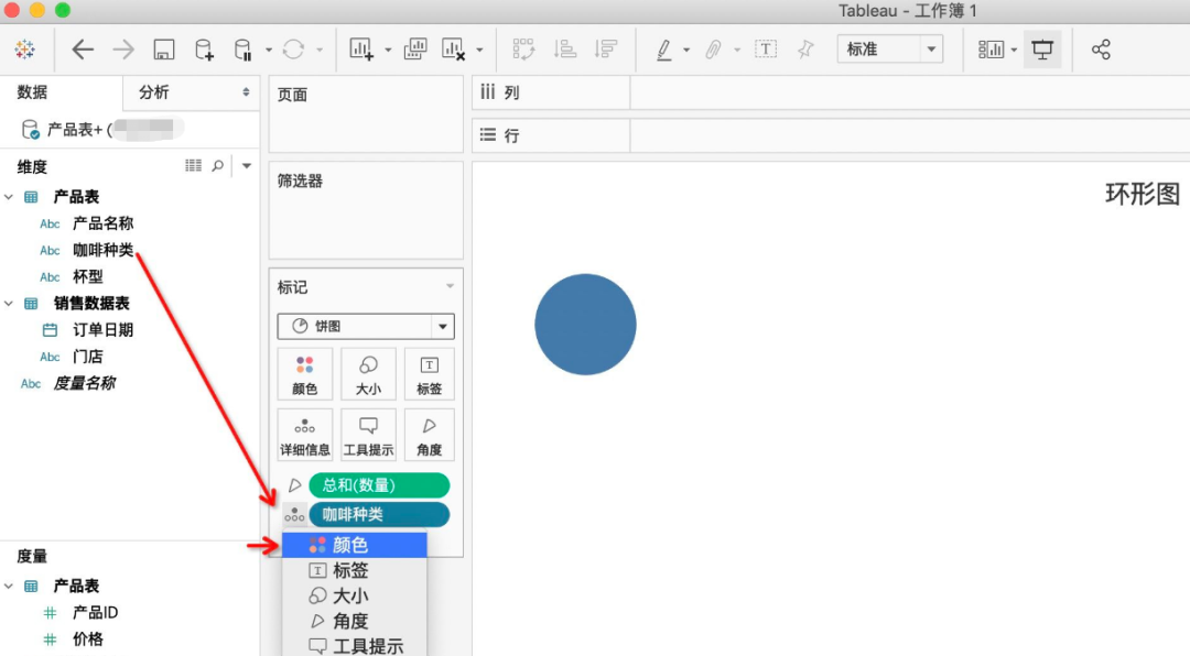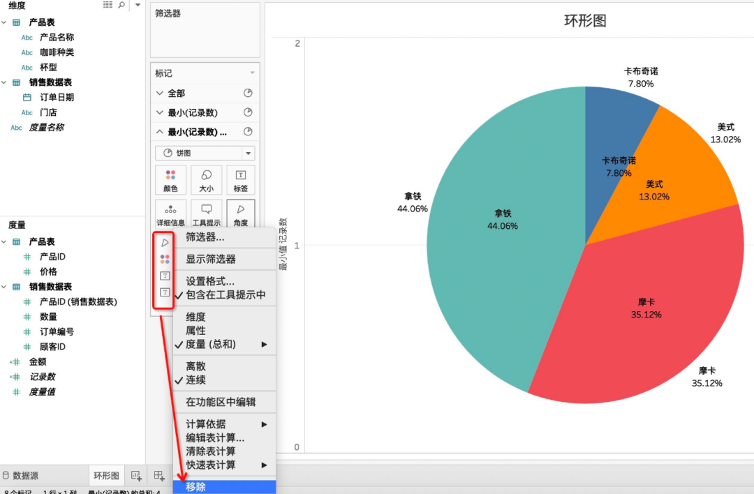 现在假如领导想要知道每种咖啡的下单数量占总数量是多少,如何用Tableau来实现呢?