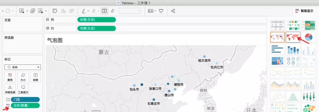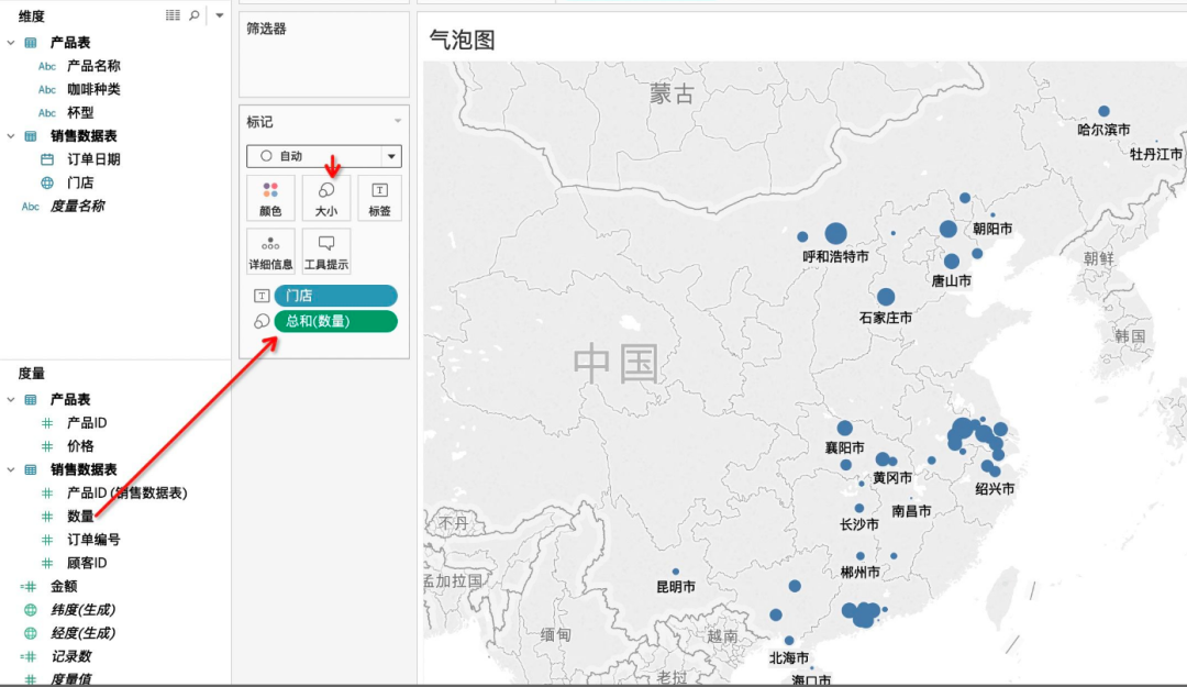 接着,把门店设置为标签,将数量拖入标记中,选择大小,这样就会显示符号地图的效果。气泡的大小表示数据的大小,在本案例中,气泡越大,表示该地区的销量越大。