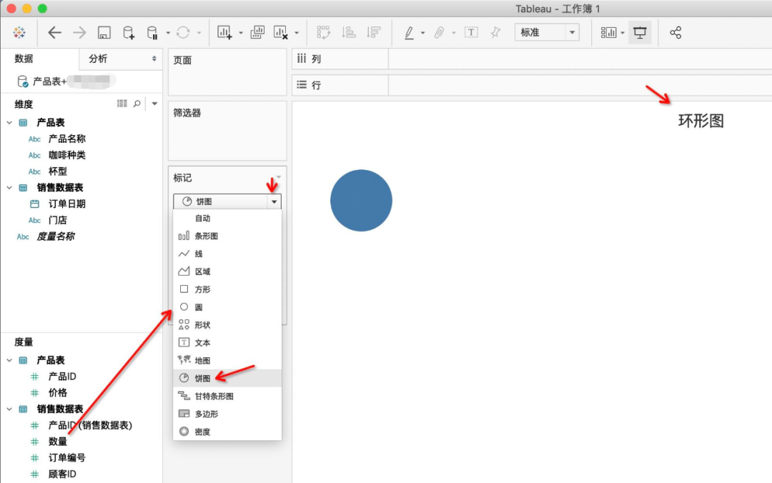 首先,新建工作表命名为环形图,标题居中,将数量拖至标记,图形选饼图: