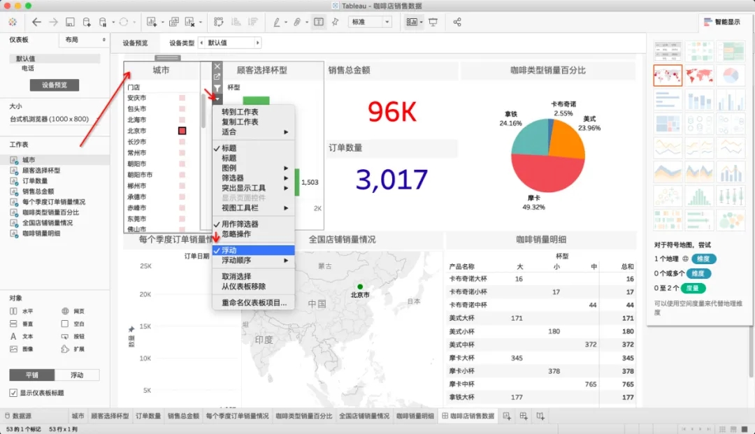 在仪表板中也可以设置工作表为浮动,自由调整大小和设置图层顺序,管理彼此重叠方式