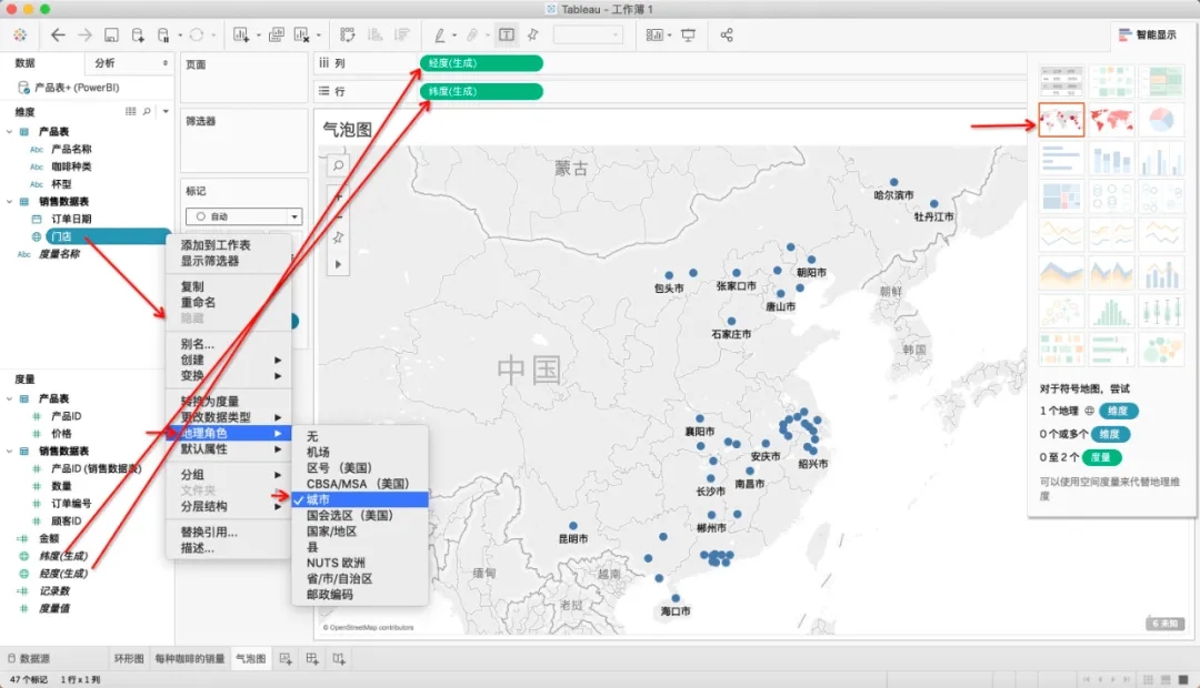 气泡图可以直观的显示不同地区的数据大小。例如,想知道不同地区的咖啡销量是多少,就可以把门店地理角色设置为城市,将门店拖入标记中,并分别将维度、经度拖至行 列中,选择“符号地图”(下图红框)