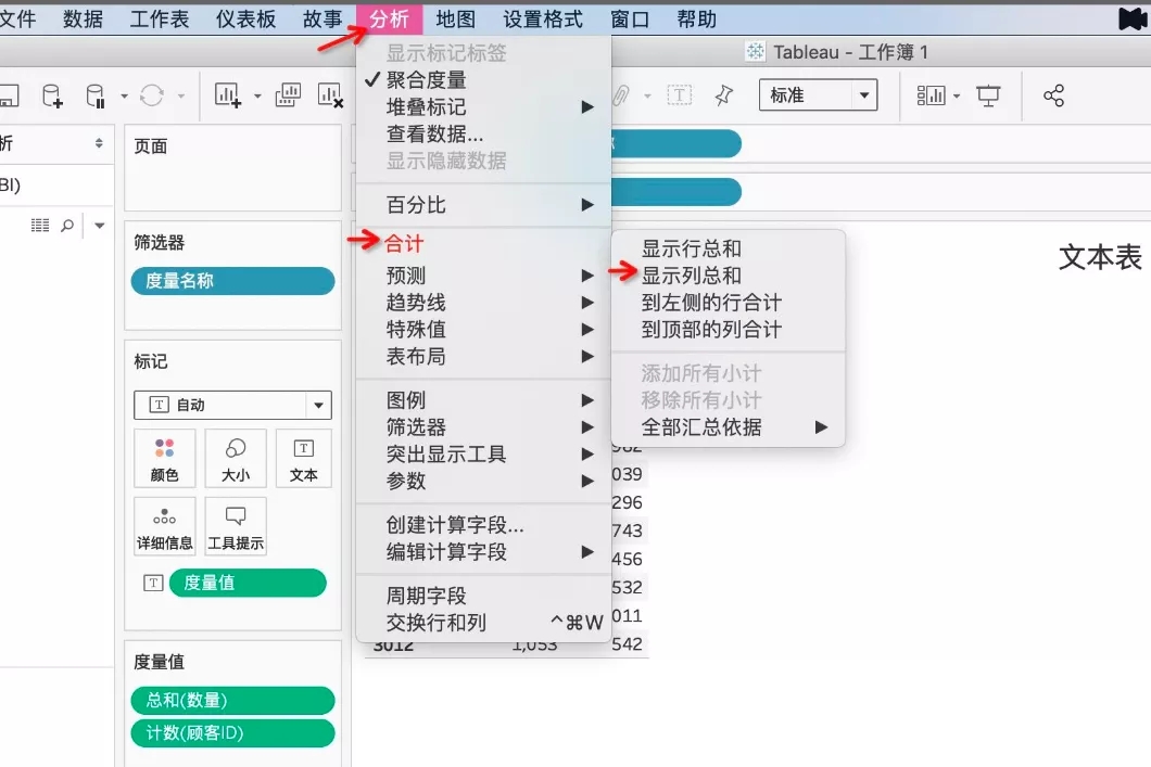 选择分析---合计---显示列总和,文本表即完成