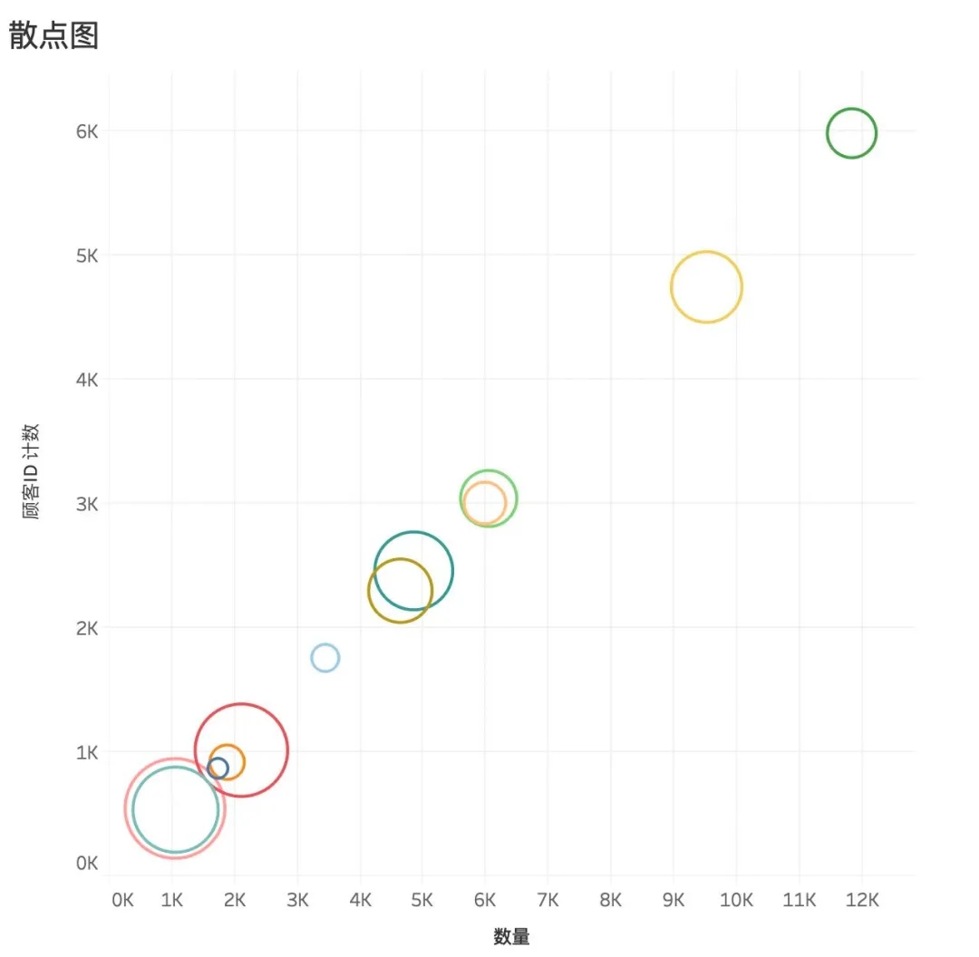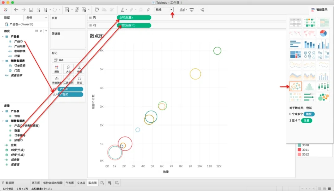 在Tableau中选择“散点图”,按下图添加所需的数据,就可以绘制散点图