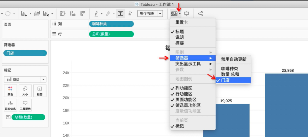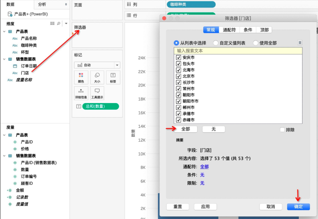 在原有工作表每种咖啡数量的基础上,我们将【门店】拖入筛选器中,选择全部-确定