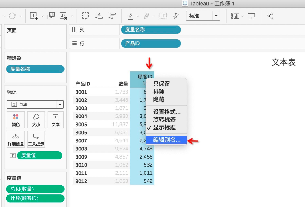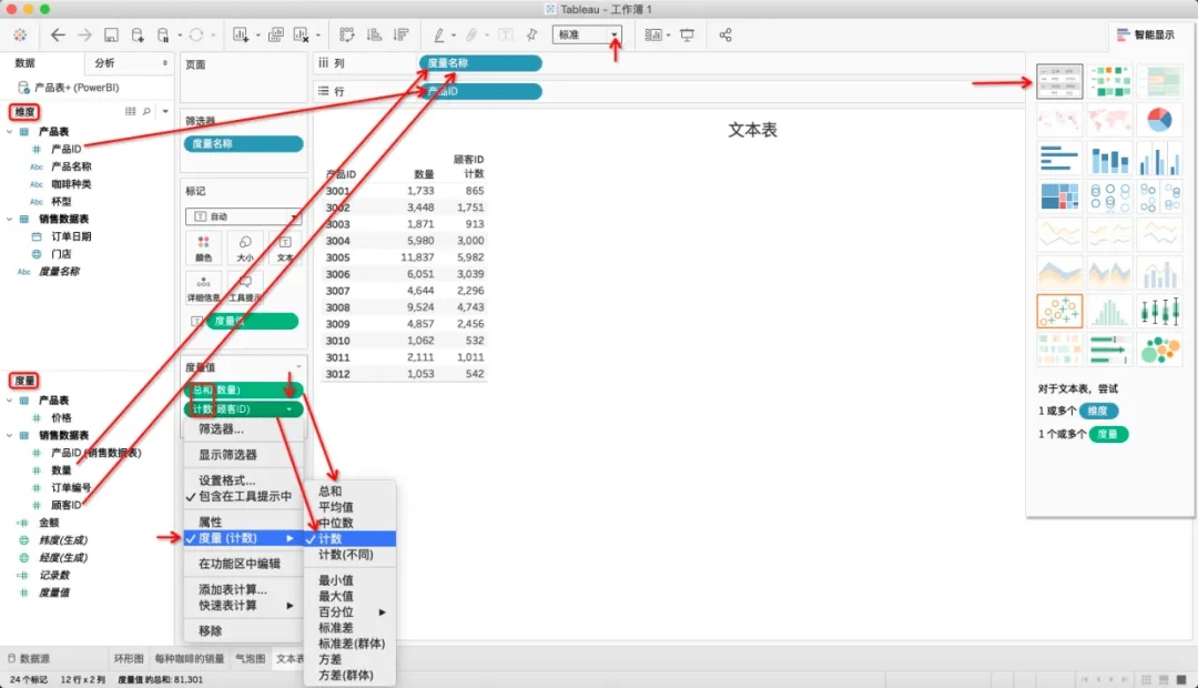 例如,来分析每种产品的销售数量,在Tableau中选择“文本表”,按照下图添加所需数据