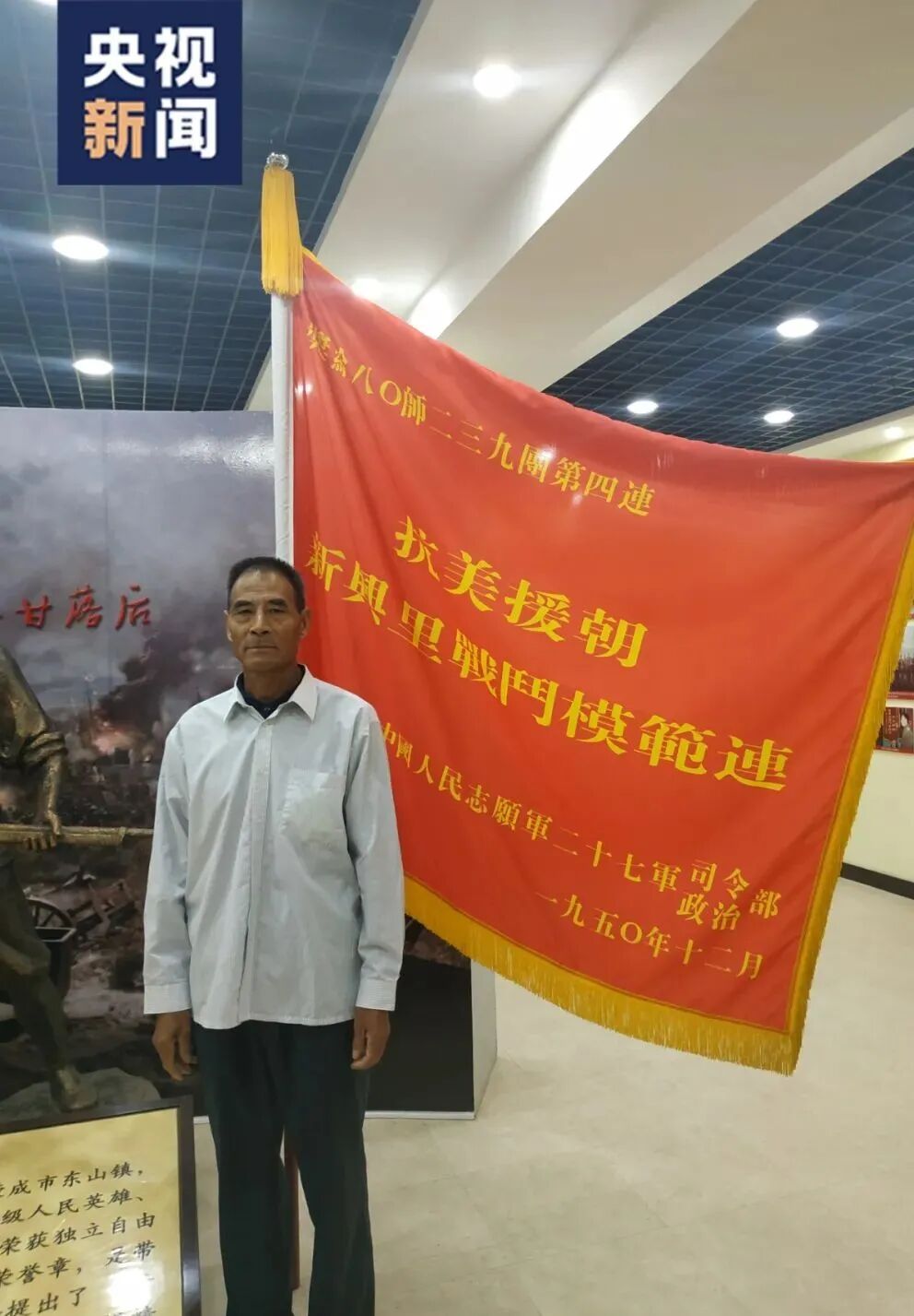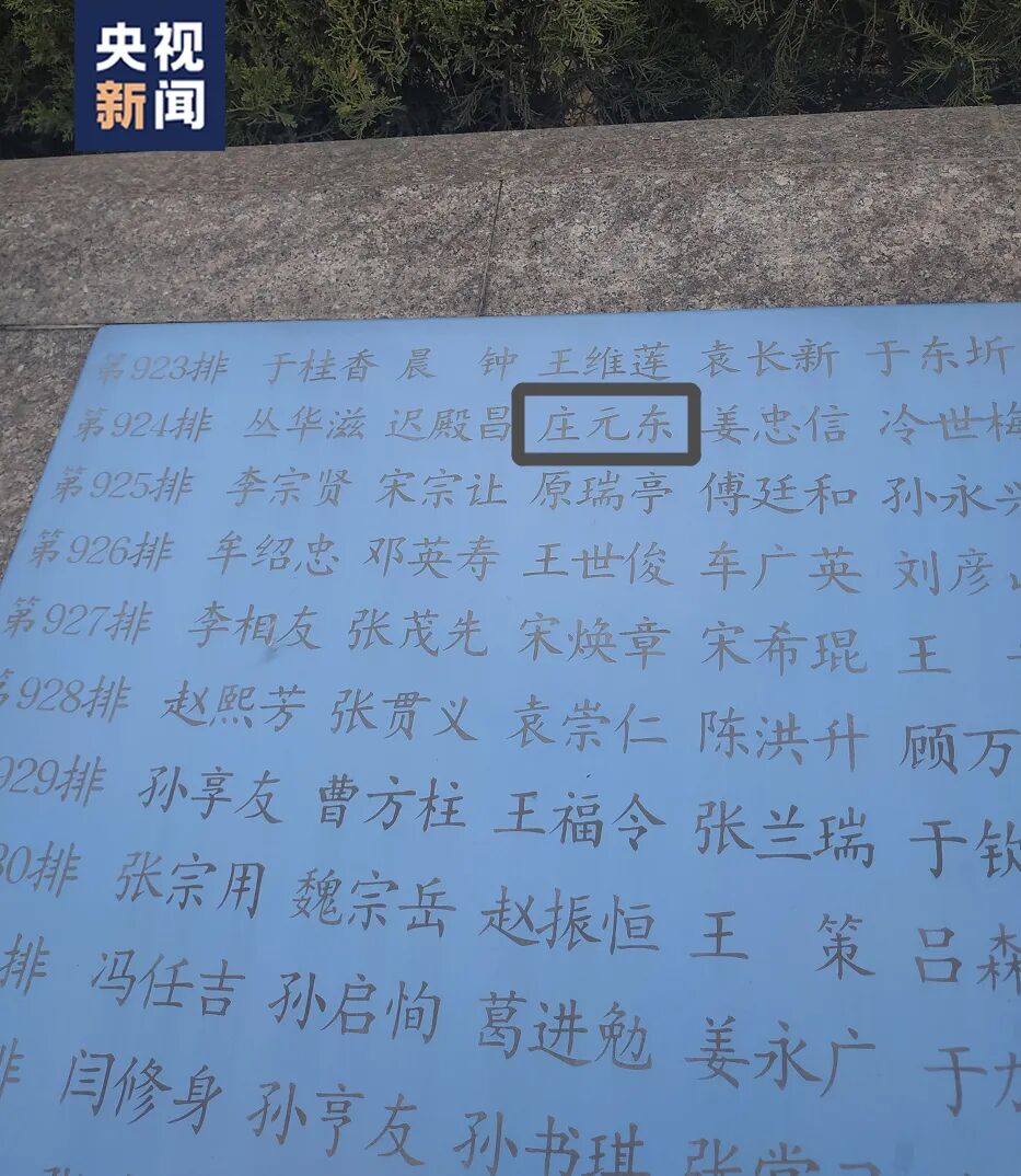 △陈列在军事博物馆中的“北极熊团”团旗 据庄元东的战友王祥麟回忆 庄元东牺牲前都没吃上一口饱饭 “他三天只吃了三个 冻得比石头还硬的土豆 每次吃的时候,他都先揣到怀里 融化一层啃一层” 而那块曾被庄元东 披在身上的“毯子” 就是“北极熊团”的团旗 2020年10月 庄元东三弟的儿子庄步瑞 来到他生前所在连队 才了解叔叔在战场上立下的功劳 △庄元东的侄子庄步瑞 他可能至今依然长眠沙场 家人、战友还在等他“回家” “回家乡盖间房子,想有个家” 是电影中“雷公”的心愿 庄元东的家人、战友、生前连队 至今还在等待他“回家” 根据庄元东生前所在连队 和“我为烈士来寻亲”志愿者的寻找和推断 庄元东的遗骸 应该在朝鲜新兴里志愿军墓地 虽然庄元东再也没能踏上故土 可能依然长眠在那片战斗过的土地上 但家乡的人民没有忘记他 △志愿者修复的庄元东照片 如今 在山东省济南市中国人民解放军 山东老战士纪念广场的纪念碑上 就雕刻着庄元东的名字 家乡以这种方式永远铭记他 多想让他看看,如今的盛世繁华 △庄元东烈士的名字刻在纪念碑上 抗美援朝战争 19万7千多名英雄儿女 为了祖国和人民献出了宝贵生命 如今 山河无恙,国泰民安 我们永远铭记英雄的功勋