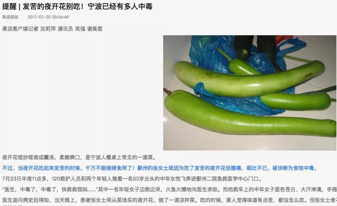 之前网上还发生过因为吃夜开花而中毒的案例。一女士认为夏天吃点苦的蔬菜能败火、养生,结果食用苦味夜开花而导致中毒,送到医院抢救。原来,开花分甜、苦两种,甜的夜开花可以放心食用,但苦的夜开花是不能吃的。因为苦夜开花中含碱糖甙,加热后也不易被破坏,误食就可能引起食物中毒,甚至会危及生命。