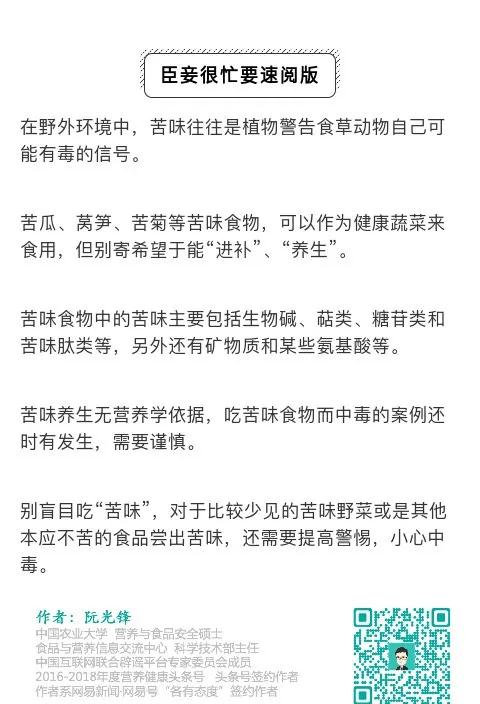 不过,对于比较少见的苦味野菜或是其他本应不苦的食品尝出苦味,就需要大家特别提高警惕,因为一旦食用,很可能会使人中毒。