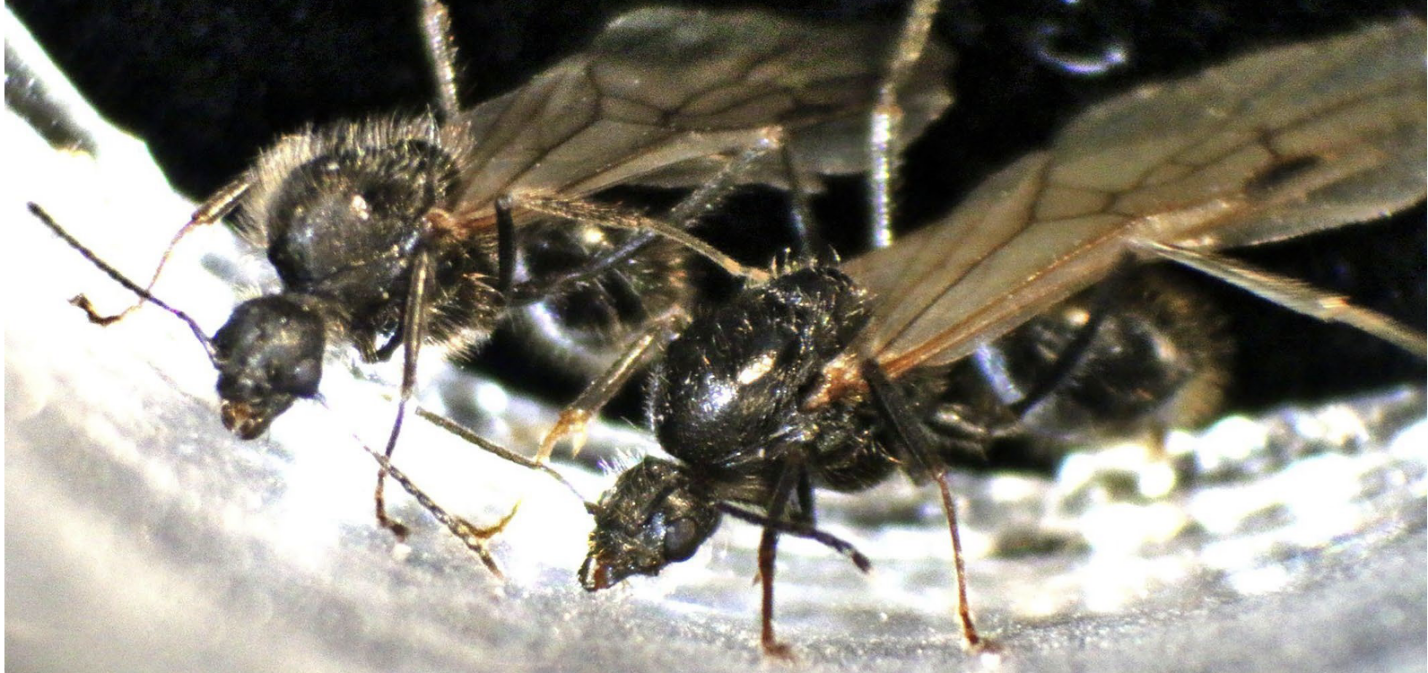 在一个巢穴出现两个物种,左边为伊比利亚收获蚁雄蚁,右边为工匠收获蚁的雄蚁