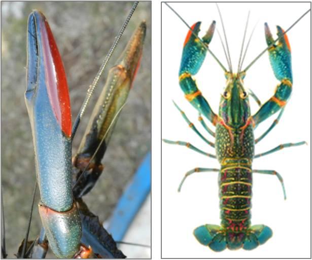 ▲左图为澳洲实地考察的红螯螯虾,右图为相同生长环境下红螯螯虾两种体色的对比,其颜色与性别无关。(图片来源:作者提供)