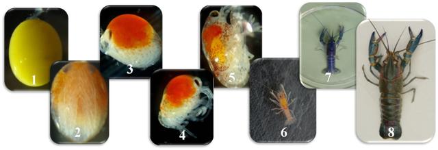 ▲图为红螯螯虾的胚胎发育过程,1:受精卵;2:复眼色素形成期;3:脱膜前期;4、第一次脱膜后的