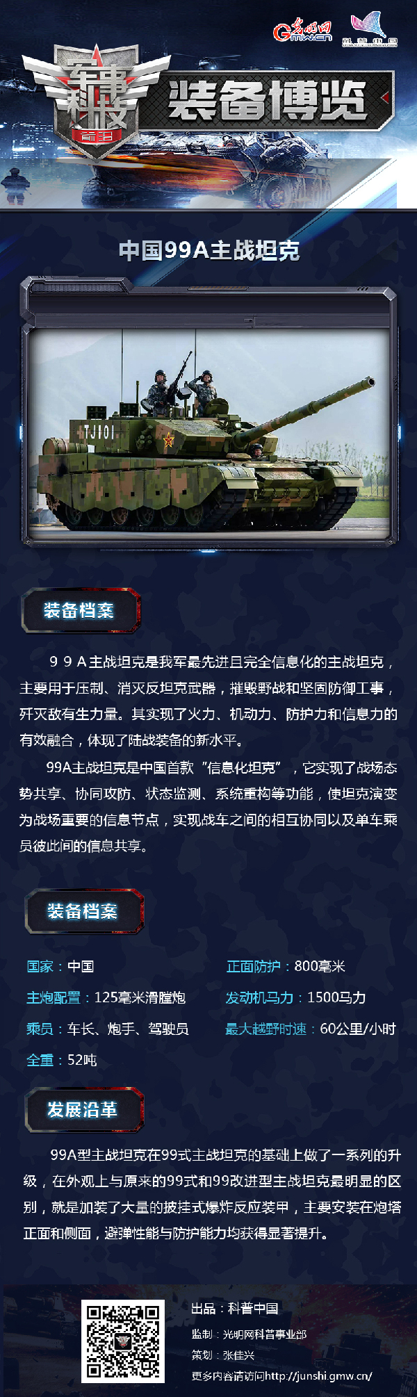 99A型主战坦克拥有强大的火力、先进的爆炸反应装甲、强劲的1500马力发动机、灵活的机动性以及现代战争越来越看重的信息化能力。该型坦克还拥有世界上独一无二的主动激光自卫武器系统及激光告警装置,能在压制敌方坦克观瞄仪器的同时提供来袭武器的预警信息,提醒车内乘员采取反制措施。