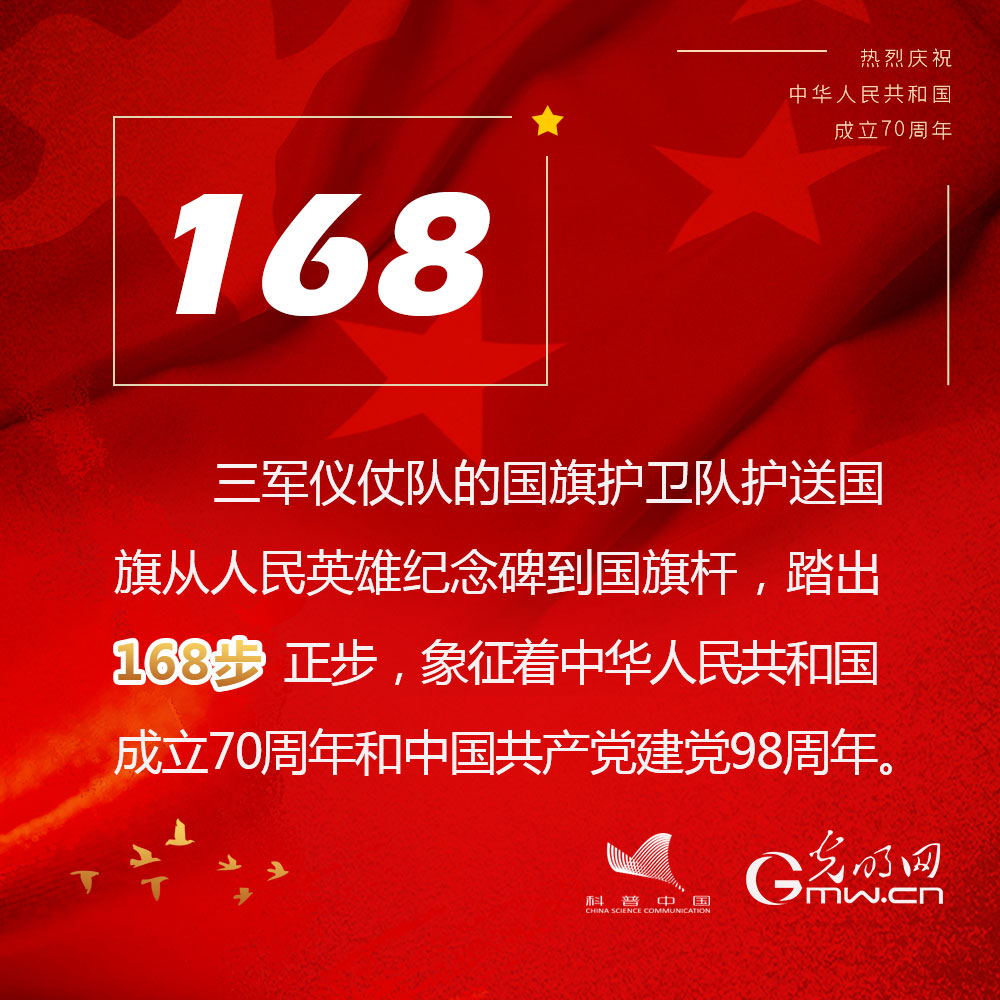 三军仪仗队的国旗护卫队护送国旗从人民英雄纪念碑到国旗杆,踏出的168步正步,象征着中华人民共和国成立70周年和中国共产党建党98周年。