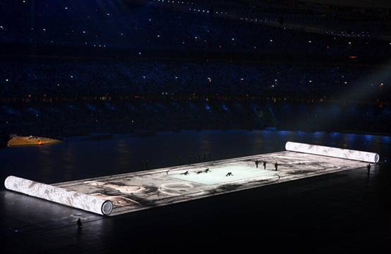 奥运五环在鸟巢中缓缓升起,飞向浩瀚夜空;中国古代书画卷轴缓缓展开,呈现出水墨画的古典意境;古老丝绸之路上,巨大的木舟乘风破浪——这些令人震撼的视觉效果都是由鸟巢华丽的灯光勾勒出来的。