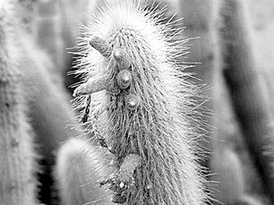 吹雪柱:原产自南美玻利维亚山地。在仙人掌家族中,吹雪柱无论是名字还是形状都是特立独行的。远观它就像是某种毛毛虫的老巢,更为诡异的是它开的花,吹雪柱一般夏天开花,花似虫子更似从仙人掌里钻出的小手指。