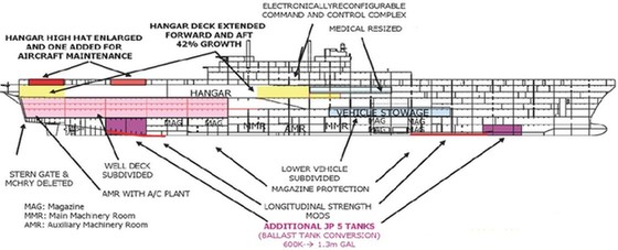 扩大了机库甲板面积后得以重新组合并扩充了航空维修设施,尤其是增加了零部件及配套设备,使LHA6具备了更好的维修能力。舰上空间扩大也提供了额外的燃料及军械搭载能力,有效提升了在航率及任务能力。
