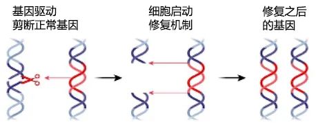 此后,细胞发现DNA受损,就会尝试对其自动修复。修复当然要有对应的蓝本,不用说,就是基因驱动中的那个坏基因了,于是,依葫芦画瓢的结果就是拥有了一对等位坏基因,从没有那么惨的Aa变成了更惨的AA。同时基因编辑工具还得到了保留,以至于坏基因一直流传下去,真是一坑到底。