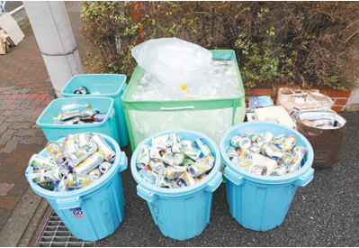 在东京一栋住宅楼前,整齐摆放着已经分好类的可回收垃圾。