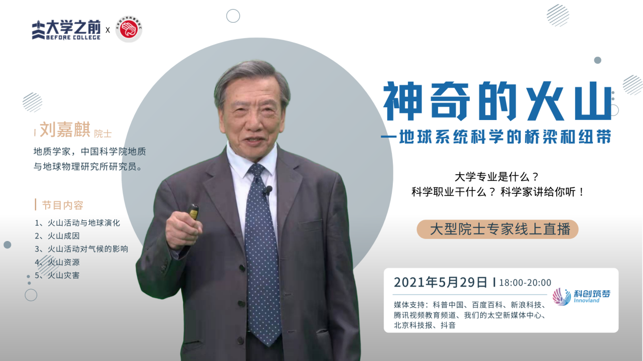 《大学之前》院士专家线上科普直播活动,刘嘉麒院士开启2021年第一期!科普中国网 2021-05-26 |