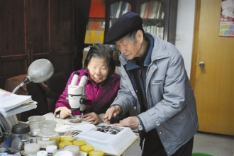 费梁和妻子叶昌媛一起探讨学术。本报记者 张文摄