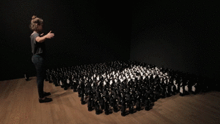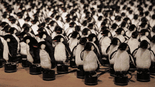 好吧并不是真的企鹅,是一群企鹅玩具组成的阵列。那怎么就成了镜子呢?其实,每只小企鹅下面都有个转盘,带着企鹅左右转动,因为企鹅是黑衣服白肚皮,所以黑白两面就可以对比形成轮廓,再接个摄像头,就变成一面可爱的企鹅“镜子”了~