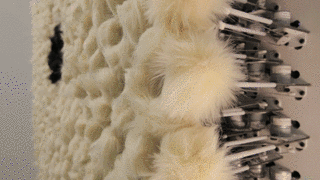 和企鹅镜子类似,通过黑、黄两种色差较大的毛球,然后配合Kinect,当人站在毛绒“镜子”前面的时候,就可以反映出被探测者的影子啦~