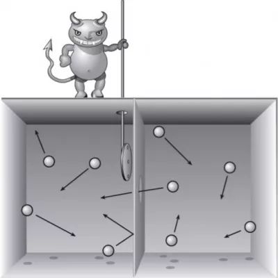 假设有一个充满气体,并且中间有一道隔门的房间,房间的左边气体更热,运动速度更快。房间右边的气体更冷,运动速度更慢。那么如果把中间的隔门打开,那么左边和右边的气体应该会混合,最后达到平衡,房间的熵增。一般情况下事情的进展应该是这样的,这也是热力学第二定律的预测。