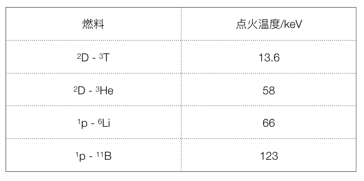 相比于氘氚聚变,无中子反应中作为燃料的原子核通常原子序数更高,即携带的电荷量更大,因此它们之间的库伦斥力也更强,两个原子核极难接近,相应的点火温度就更高。下面列出了几种无中子聚变反应的点火温度,可以发现,与氘氚聚变相比,几种无中子聚变的点火温度要高出数倍,而它们的反应截面却要小得多。[2]